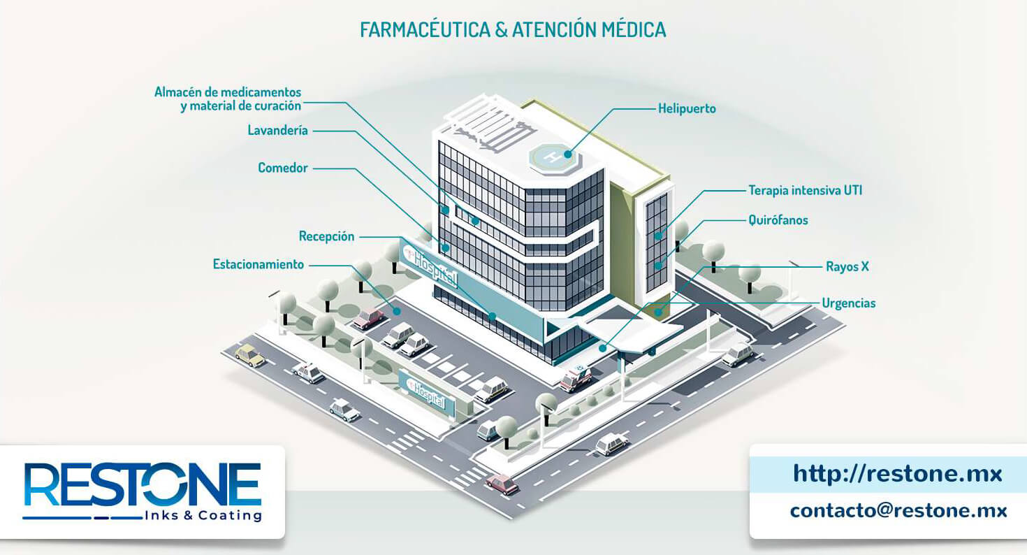 En los hospitales e instalaciones médicas las alternativas duraderas son los pisos epóxicos sin uniones, resistentes a las manchas y de fácil limpieza. Y para los quirófanos y otras áreas sensibles, a menudo se recomiendan los pisos de uretano.